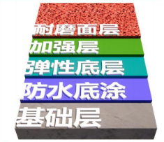 6、摩擦力强:采用柔性止滑材料加耐候面漆喷涂技术,平而不滑。(划线 跑道面层 缓冲层 底涂层 基面层)