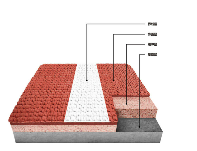 8、免维护:无脱粒掉屑现象,具有一定的自洁性能,标线历久常新,只需日常的清扫,无需专业的维护。(划线 跑道面层 弹性缓冲层 胶水层 基面层)